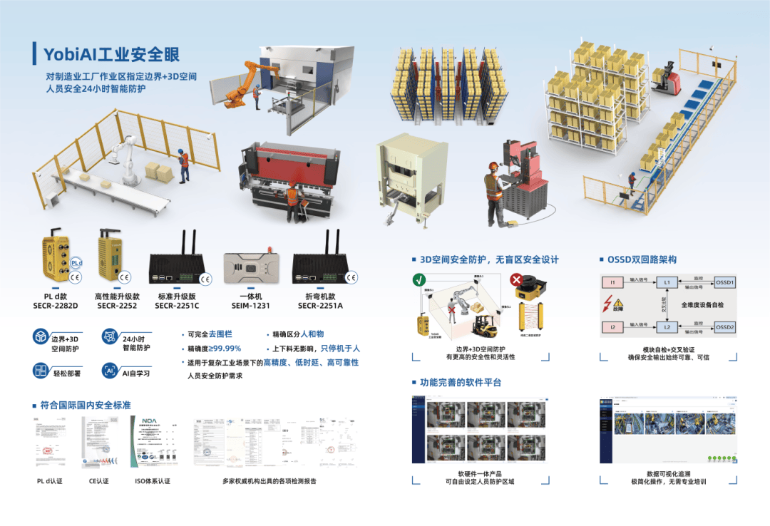若何既不影响出产,又能绝对保障平安?团队自从研发了一款“即插即用”的尺度化AI工业平安产物。可其时的机会,并不容乐不雅——公司刚成立,就撞上了本钱严冬,市场上的资金都正在押短期能变现的风口项目,持久研发的工业AI项目置之不理。姚潇判断决策,率领团队走“难而准确”的:不逃风口、不急融资,将仅有的启动资金全力投入研发。手艺团队深耕算法调试,营业人员驰驱工场实地测试,产物历经上百次迭代优化。正在产物设想上,玉贲智能团队采用“单目视觉3D定位”手艺,相当于给通俗摄像头拆上“立体眼”,不消多镜头或传感器,就能精准判断工人、机械臂正在三维空间的,避免误判;此外,通过自研的“Multi-Pipeline高机能算法处置框架”,把“识别人员进入防护区域→发出停机/减速指令”的全流程压缩到80毫秒内完成——比人类的反映极限快数倍。产物的成长,从来不是闭门制车。姚潇至今记得,她曾有幸对接到全球工业平安范畴的企业高管,对方从产物设想若何合适国际功能平安尺度、产物的机能若何愈加工业化、产物接口的专业性和外不雅标识的尺度化等方方面面,拿着产物一口吻提了几十条改良。“我和同事们实的出格高兴,恰是这些让产物更成熟。”姚潇回忆,其时团队人员正在对接时奋笔疾书,生怕漏掉一个点,回公司后立马分组拆解问题,耗时数月将所无为优化点,使产物质量全面临标世界一流尺度。就如许,正在一次次手艺攻坚和客户反馈的打磨中,YobiAI工业平安眼从最后的概念原型,慢慢变成了国表里首个AI平安视觉标品,现已笼盖工业六轴机械人、协做机械人、折弯机、桁架、冲压机床、智能仓库、激光切割机、压铆机、铆合机、天车等多个功课区,成了守护工人平安的“标配”。